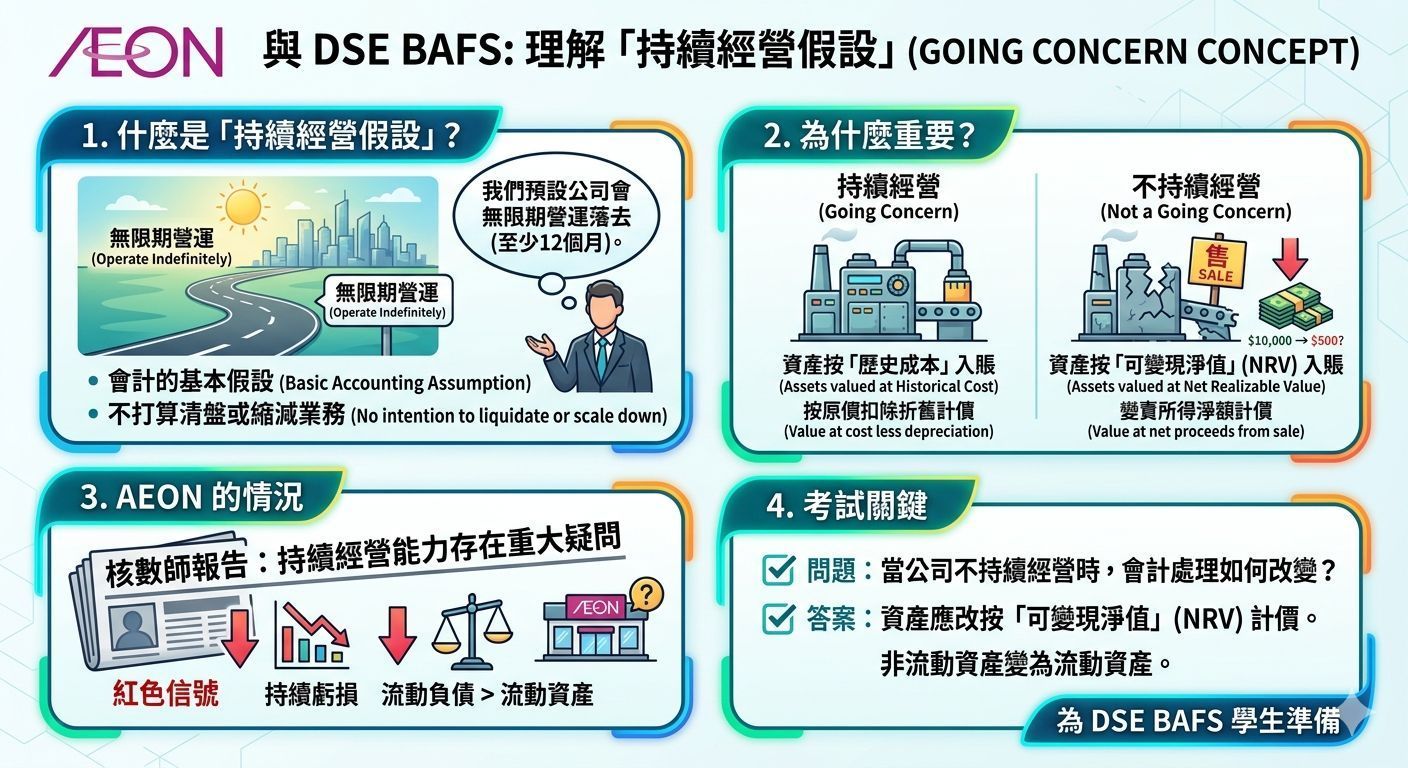 1. 童年回憶「吉之島」母企Aeon於發表新一財年財報時被核數師披露「持續經營存重大不確定性」,呢個正正係DSE BAFS Accounting Principles 一課裡面學嘅Going Concern Concept 2. 一般而言,企業係會被假定為Going Concern個體,即於可見將來繼續營業及無意圖清盤,因此企業嘅資產會以歷史成本扣減折舊計價列於財報 3. 當出現以下3個情況:1. 企業已連年虧損 或 2. 企業凈負債過高 或 3.企業現金流出現問題,核數體須披露企業持續經營能力存疑、當中原因 及 財報上資產價值嘅計升依歸 4. 睇返Aeon盤數,過去兩年分別蝕3億4與3億3;流動凈負債15.6億(倒返轉睇current ratio 啱啱好得0.5);現金由8.2億跌到6億,要生存落去似乎只有日本母公司泵水一途 5. 希望AEON唔好好似大丸咁成為歌詞上嘅時代印記