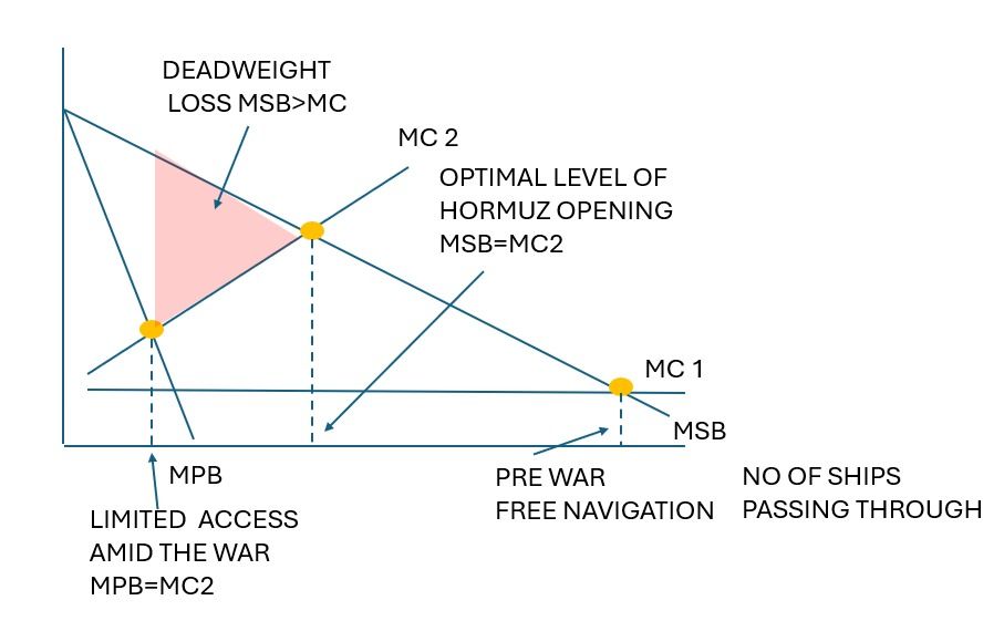 1. 伊朗近日開價200萬美元,但要以伊朗幣埋單,換取船隻通過霍爾木茲海峽,正正係用私人市場方法解決界外效應嘅好例子 2. 霍爾木茲海峽被稱作全球石油咽喉,每年多達2千萬桶海灣國家嘅油經呢個海峽運往世界各地,戰前海峽趨近自由使用,與本身保護海域邊際成本穩定且低廉有關 3. 及至戰時,於海峽放行船泊嘅邊際成本與挾迫海灣國家促美停戰及伊朗自家油產破除制裁束縛賣得高價兩大因素捆綁下飆升,致令伊朗幾乎不準船泊通過,放行點就擱在MSB>MC,形成世紀凈損失 4. 除著油價高企引致環球經濟問題,個MSB<>MC spread會愈嚟愈大,伊朗將國運架設咗喺國土南部寬度只有32公里嘅霍爾木茲海峽,挾油意令全球成為命運共同體,換伊朗幣俾錢入短期能救匯,亦給友好國家一點便捷,長期換取各國施壓促使美國停手,伊朗MPB逐步提升(界外利益內部化),放行量才能歸於正常水平 5. 一物治一物,有時唔係下下用劍嘅