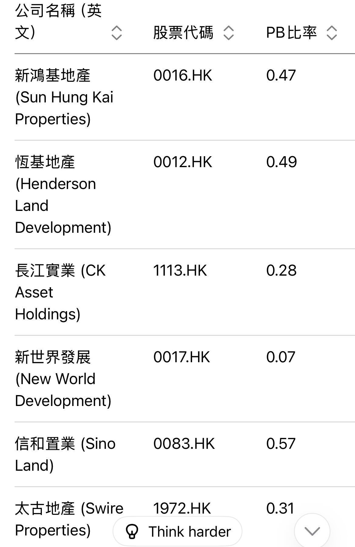 5. 用AI SORT咗香港地產商嘅PB做參考,0.07至0.74不等,一律有所謂管理層折讓的,以PB表現算最好嘅領展來說,股東只願用$74買領展持有$100資產,原因很簡單,資產是值錢,但在你手上會變怎樣是存有變數的,所以強如房產有客觀價值嘅資產,公眾都未必會用等價去買一間公司嘅股票