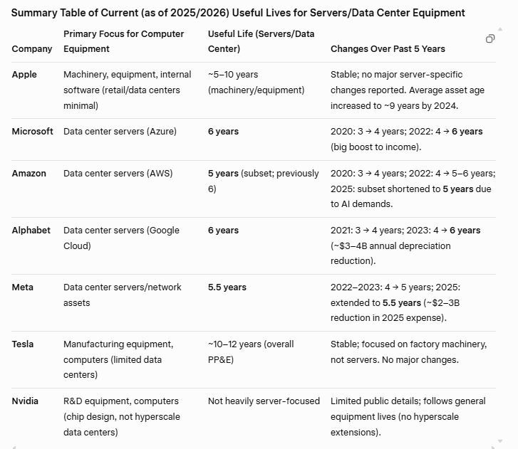 2. 進入AI軍備競賽,君不見科企動輒以數以百億掃晶片及其他AI相關設備。為免影響盈利,呢啲科企悄然在過去5年間調節對電腦設備折舊嘅使用期限,大部分由2020年開始將折舊3年嘅期限放寬至6年,換句話說每年折舊支出因此削半
